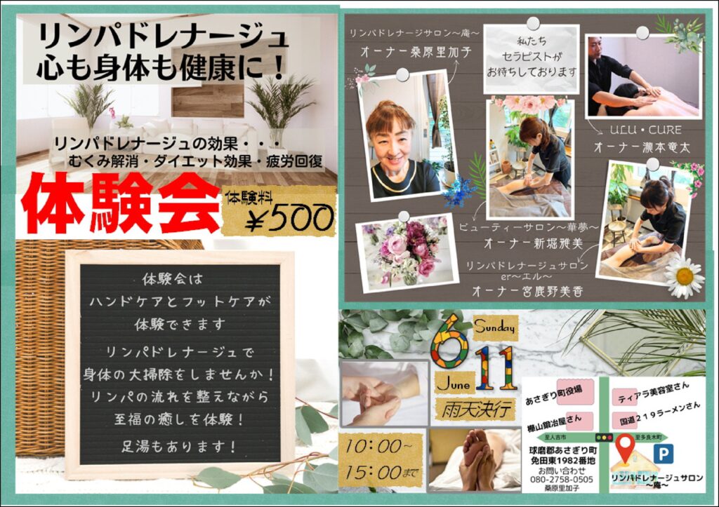 2023年6月7日 / 最終更新日時 : 2023年6月7日 rikakomama 未分類 体験会のお知らせ 6月11日(日)にサロン庵にてリンパドレナージュ体験会を開催します。 時間 10時~15時 場所:熊本県球磨郡あさぎり町免田東1982 お問合せ 080-2758-0505 雨天決行 体験会は、ハンドマッサージとフットマッサージが体験できます。