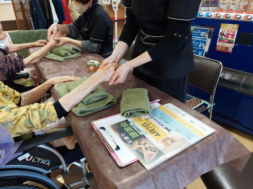 利用者の方々、職員の方、ボランティアの方、皆様に心を込めてハンドマッサージの施術を行いました。