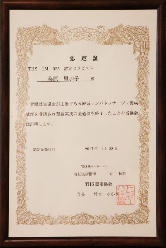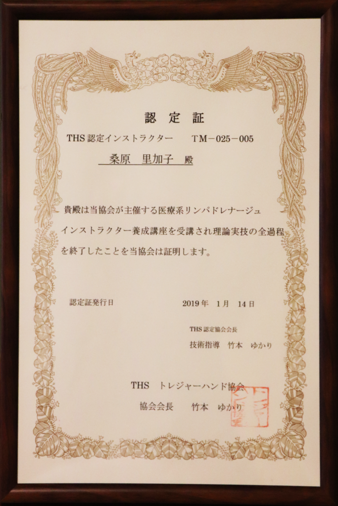 THS認定セラピスト 認定証